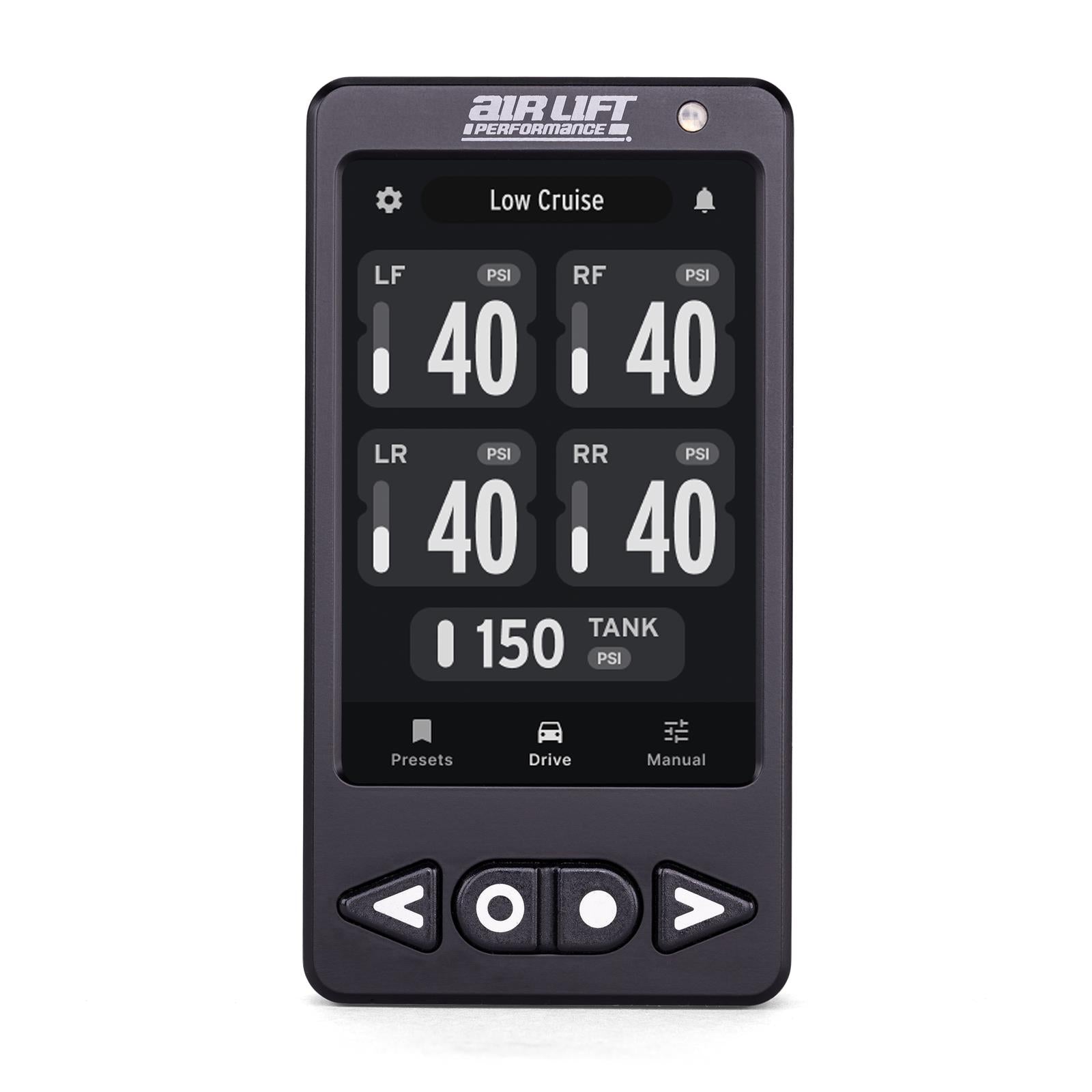 The ALP4 air management system redefines what’s possible for air suspension control, combining cutting-edge hardware with smarter, more seamless functionality. This system features a compact, all-in-one manifold, which houses the ECU, solenoids, and pressure sensors, crafted from anodized black billet aluminum for durability and a sleek, show-ready appearance. Paired with a full-color touchscreen controller framed in anodized aluminum and equipped with four tactile physical buttons, this system offers immediate control for your presets, 4-corner manual control, axle adjustments, full air-out and other adjustable functions. With mobile app integration, ALP4 allows you to use and fine-tune your setup from anywhere, ensuring ultimate control.