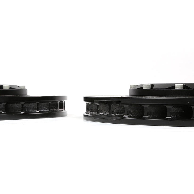 - Two-piece drilled, slotted, or drilled & slotted rotors with lightweight aluminum center bells. Rigid steel center bells are equipped for the rear rotors integrated with inner drums